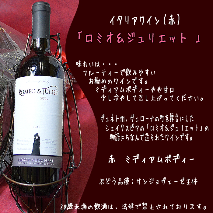 トップ > アルトミルナーレ > 送料無料!イタリアワイン(赤)とバラの花束イタリアワイン「ロミオとジュリエット」(赤)とバラの花束