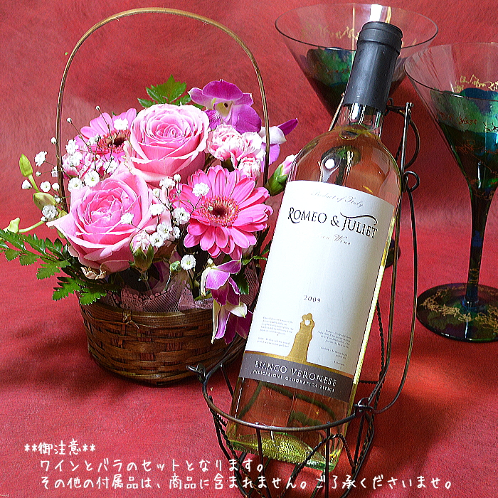 イタリアワイン「ロミオとジュリエット」(白)とバラの花束