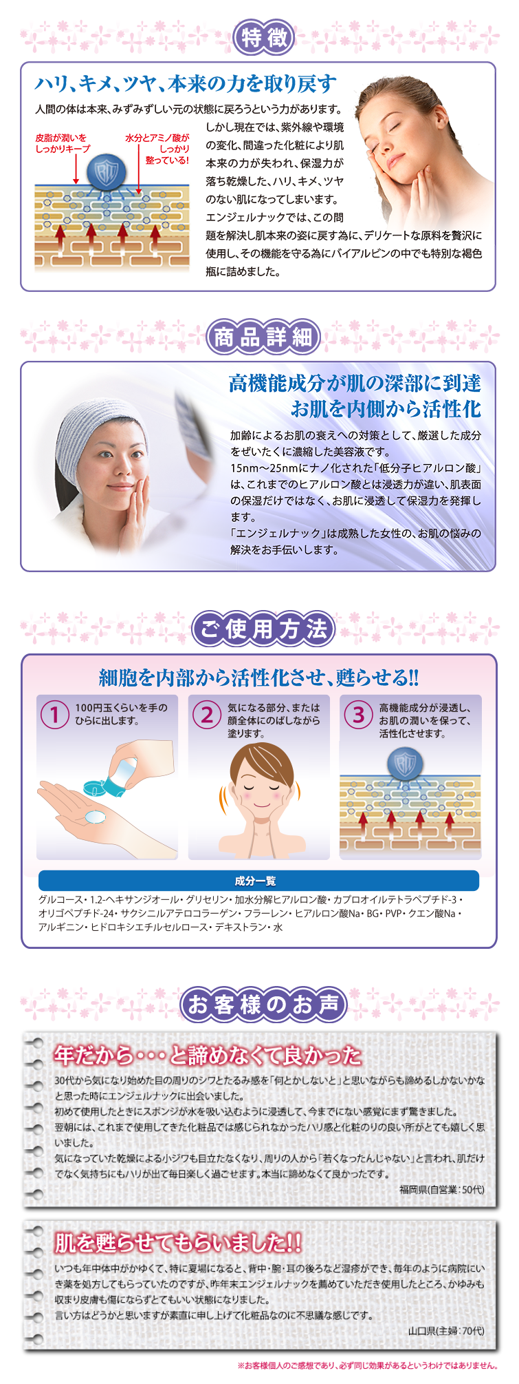 人の体な細胞の集まりです。肌も同じようにそれぞれ重要な役割を持った細胞で構成されています。その細胞を活性化させ本来の姿に戻すことが、本当の意味での「アンチエイジング」かもしれません。エンジェルナックはアミノ酸の集合体であるペプチドやコラーゲン、ヒアルロン酸等を贅沢に配合し、肌のハリと弾力性を是非実感してください。また、ジェルナックは効果の高いデリケートな原料を使用しているので、バイアルビンの中でも特別な、遮光性の高い褐色瓶を使用しています。