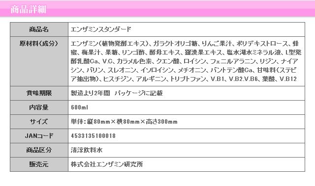 エンザミン(植物発酵エキス)、ガラクトオリゴ糖、りんご果汁、ポリデキストロース、蜂蜜、梅果汁、果糖、リンゴ酢、酵母エキス、羅漢果エキス、塩水湖水ミネラル液、L型発酵乳酸Ca、V.C、カラメル色素、クエン酸、ロイシン、フェニルアラニン、リジン、ナイアシン、バリン、スレオニン、イソロイシン、メチオニン、バントテン酸Ca、甘味料(ステビア抽出物)、ヒスチジン、アルギニン、トリプトファン、V.B1、V.B2.V.B6、葉酸、V.B12