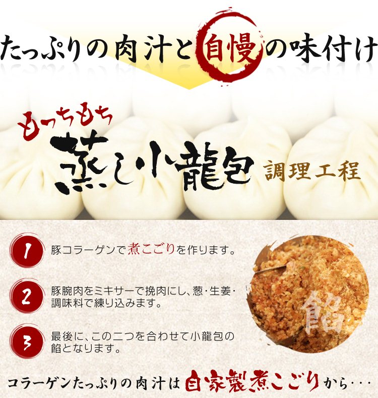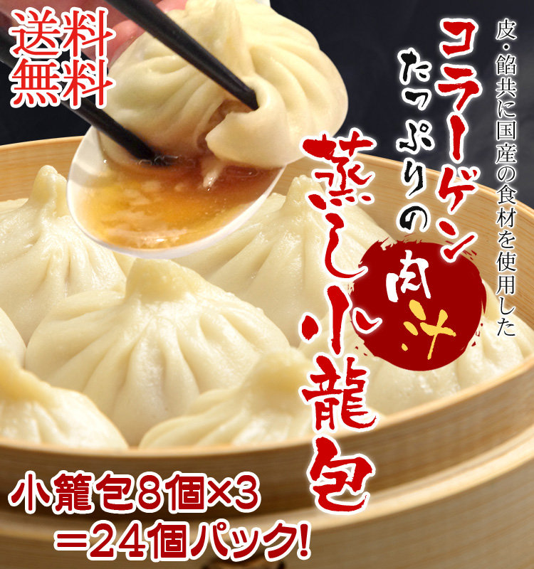 トップ > 焼き小龍包&鶏粥 龍輝 > ★超特価!送料無料★冷凍蒸し小籠包たっぷり24個セット(1パック×8個入り×3) 【戸越銀座の名店・焼き小龍包&鶏粥 龍輝】コラーゲンたっぷりの肉汁が美味しい龍輝の小龍包!